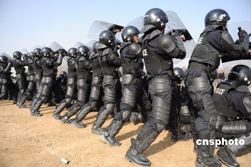 維和防暴隊員在進行處置群體性事件演練。 中新社發 由永懷 攝