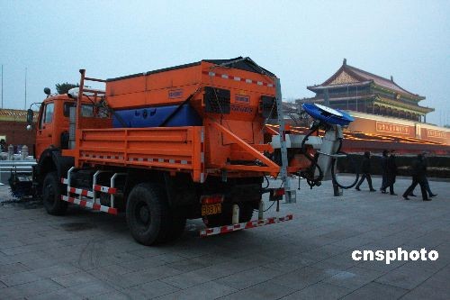 2月18日,大型掃雪車北京天安門廣場備戰(zhàn)連續(xù)的降雪天氣。氣象專家表示,此次降雪除自然因素外,人工影響天氣作業(yè)也起到很大作用,預計降雪將持續(xù)到19日。中新社發(fā) 鄭雄增 攝