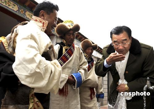 2月25日,中國藏歷年初一,西藏自治區黨委書記張慶黎冒著風雪來到拉薩市城關區納金鄉嘎巴村拜年,在村民多布杰家,他手捧自來水品嘗,稱贊水質好。中新社發 廖攀 攝