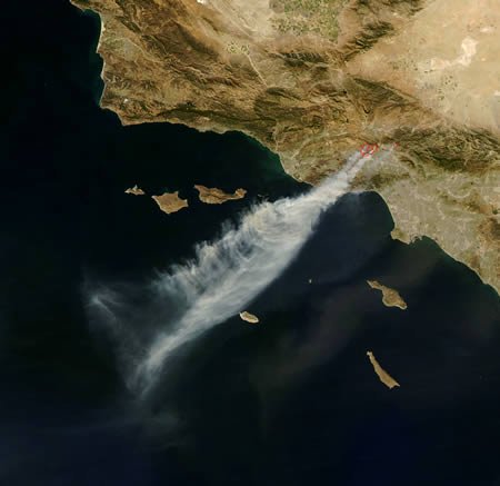 洛杉磯大火的煙霧:這張衛星圖片上清晰可見,受強大的圣安娜颶風影響,2008年10月中旬加州洛杉磯附近大火肆虐,風助火勢,濃濃的煙霧甚至飄向很遠的海面。