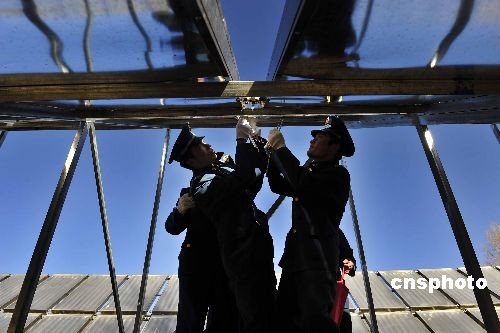 2009年春,一套由800塊太陽(yáng)能集熱板組成的“營(yíng)房聚光太陽(yáng)能采暖系統(tǒng)” 落戶西藏日喀則空軍某場(chǎng)站。這套系統(tǒng)每天能供暖8至10個(gè)小時(shí),節(jié)電4800度左右。中新社發(fā) 郭超英 攝
