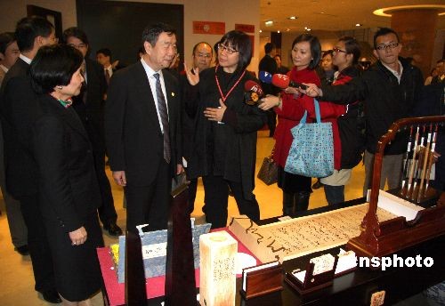 圖為鄭欣淼(左二)在臺北故宮博物院院長周功鑫(左一)的陪同下,參觀臺北故宮博物院禮品部,并觀賞依據唐懷素自敘帖制作的禮品。