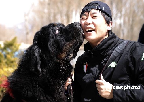 2009年初春,中新社特派記者一行到西藏藏獒協(xié)會養(yǎng)殖基地采訪,《中國新聞周刊》記者劉震被喜馬拉雅河谷型藏獒口水四濺地?zé)嵛牵旱么蠹姨湫苑恰V行律绨l(fā) 廖攀 攝