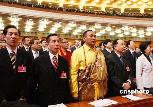 全國政協十一屆二次會議3月3日下午在人民大會堂隆重開幕,與會委員在開幕大會上高唱國歌。今年全國“兩會”在議程安排方面做出重大調整,在開幕式和閉幕式上,將原來的“奏國歌”改為“唱國歌”。這一改變采納了代表和委員的議案和提案。中新社發 宋吉河 攝