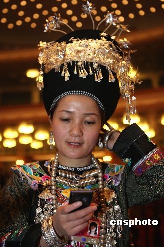 3月4日上午,十一屆全國人大二次會議預備會在北京人民大會堂舉行。來自重慶市黔江區的苗族女代表李小燕通過手機向家鄉“播報”大會盛況。中新社發 任晨鳴 攝
