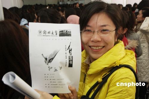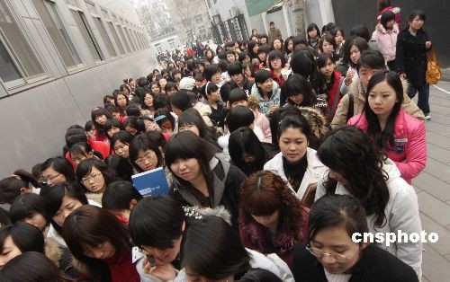 2009年3月4日,前來應聘的女大學生擠滿了會場。“三八”國際婦女節前夕,北京市2009年女大學生專場招聘會在北京市畢業生就業市場舉辦,吸引了數萬女大學生到場應聘。中新社發 吳芒子 攝