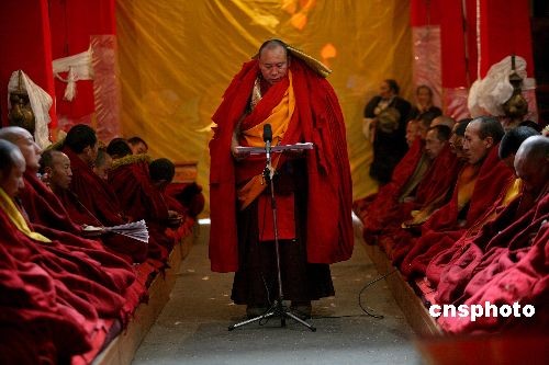 3月4日,藏歷新年正月初八,拉薩色拉寺舉行傳昭大法會,僧人們會進行傳統的辯經、祈愿、頌經等佛事活動。每年的傳昭大法會從藏歷正月初八開始,持續到藏歷正月十五。圖為在色拉寺大殿內高僧在進行誦經。中新社發 劉震 攝