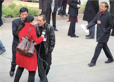 一個電視臺的女記者攔住張藝謀委員,央求給點兒“下鍋菜”,否則回去沒法交差。范繼文 攝