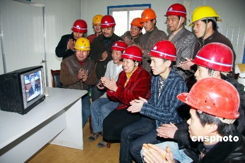 3月5日,煙臺農民工圍在一臺電視機前收看溫總理的政府工作報告。當日,煙臺市山海云天建筑工地上的農民工心系全國兩會,在工地負責人的安排下,他們坐在電視機前,收看中央電視臺現場直播的溫家寶總理在全國人大第十一屆二次會議上做的政府工作報告。中新社發 武前才 攝