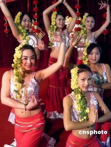 3月7日,為慶祝“三.八”國際婦女節(jié)的到來,北京植物園舉行賞花送花活動。特設(shè)的“女人花”展區(qū)內(nèi)展示的花卉名稱中均帶有“女”字:如“小葉女貞”、“舞女蘭”、“美女櫻”等。每位在熱帶展覽溫室參觀的女士,可以得到一束美麗的康乃馨。圖為云南傣族姑娘頭戴鮮花為參加活動的游客表演舞蹈。中新社發(fā) 錢興強(qiáng) 攝