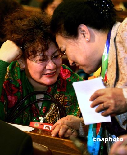 3月7日下午,全國政協十一屆二次會議舉行第二次全體會議,提前到會的兩位少數民族委員說起“私房話”。中新社發 宋吉河 攝