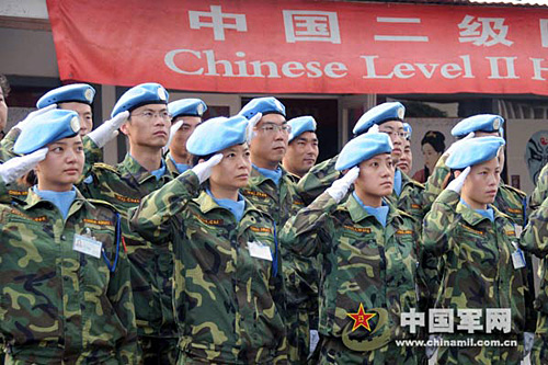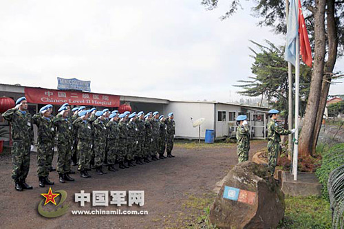 中國(guó)第九批赴剛果(金)維和醫(yī)療分隊(duì)舉行升國(guó)旗儀式,紀(jì)念三八國(guó)際婦女節(jié)。武國(guó)強(qiáng) 攝