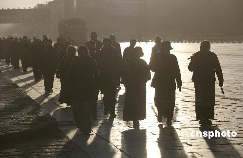 3月10日清晨,西藏拉薩布達拉宮門前來自各地的信眾絡繹不絕。中新社發 劉震 攝