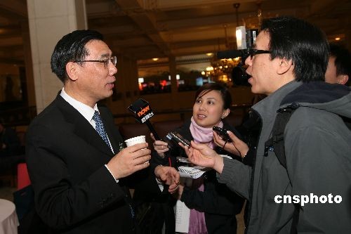 3月9日,十一屆全國人大二次會議舉行第二次全體會議。在會議間隙,旁聽大會的中國工商銀行董事長姜建清出來喝水休息,不料被記者團團圍住進行采訪。中新社發 王輝 攝