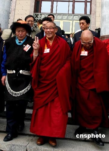 3月12日,全國政協十一屆二次會議閉幕。圖為來自西藏的宗教界委員阿旺吉卓(中)走出會場。中新社發 傅丹丹 攝