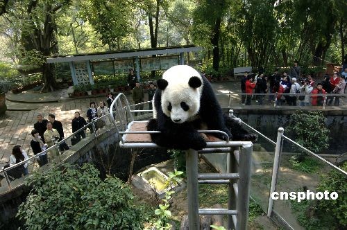 三月十二日,臺灣游客正在福州熊貓世界觀看熊貓。大熊貓“團團”、“圓圓”在臺灣產生的效應,致使現在來福州觀看熊貓的臺灣游客比以前增加三倍以上。中新社發 王東明 攝