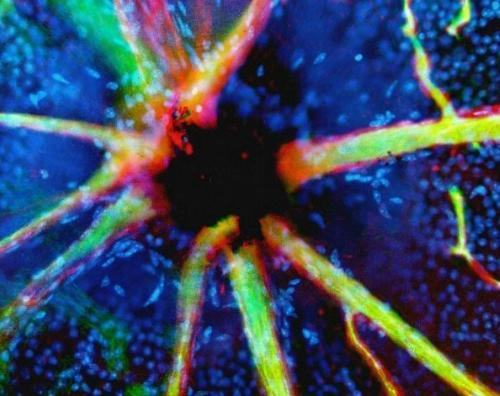 從視神經中伸出的血管:這張照片顯示的是血管從黑色視盤中伸出。視盤是個盲點,因為視網膜的這個區域沒有光感細胞,視神經和視網膜血管從眼睛后面的這個部位伸出去。