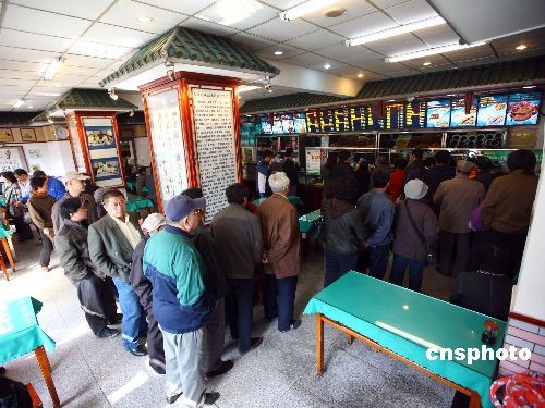 3月20日,迎來24節氣中的“春分”,意思是說春天過了一半。按照老北京的習俗,“春分吃豆面糕(驢打滾),避邪祈!。北京著名護國寺小吃連鎖店為這天的到來準備了1萬多個驢打滾。圖為在護國寺小吃店了排隊買驢打滾的民眾。中新社發 富田 攝