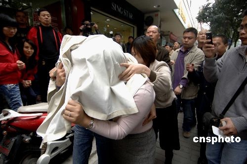 三月二十三日上午十一時(shí)十分左右,三名被解救的人質(zhì)掩面走出典當(dāng)行。中新社發(fā) 王東明 攝