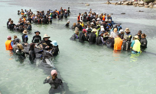 圖:澳大利亞志愿者營救擱淺的鯨魚和海豚