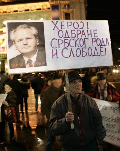 人們高舉前南聯盟總統米洛舍維奇的畫像。