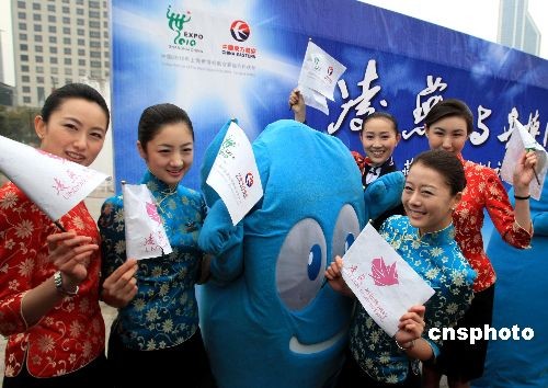 2009年3月27日,上海世博會倒計時400天,東方航空公司的中、日、韓籍空姐及“凌燕世博乘務(wù)組”,冒雨在上海人民廣場參與上海世博推廣公益活動。中新社發(fā) 潘索菲