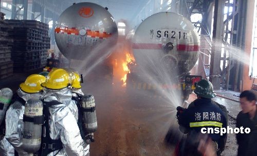 2009年4月13日上午9時許,兩輛液化氣槽車在位于洛陽市城區北部的紅山工業園區洛北鑄鋼廠內作業時引發氣體泄漏燃燒事故,噴出的液化汽火焰在槽車罐體側部和底部不斷燃燒,罐體溫度不斷升高隨時都有爆炸危險,周圍數平方公里的生命和財產面臨嚴重威脅。洛陽消防支隊的10輛消防車輛和80名消防官兵,在多方噴水降溫的同時,冒死沖入火海中控制泄露部位并將兩車有效分離,經過2個多小時的撲救,阻止了一起嚴重爆炸事件的發生,事故未造成人員傷亡。目前事故原因正在調查之中。 中新社發 張曉理 攝