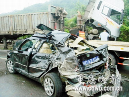 21日下午4時(shí)過,記者趕到現(xiàn)場,高速路執(zhí)法隊(duì)員正在處理現(xiàn)場,救護(hù)車剛離開,從白市驛到永川段的高速路口全面封閉。記者看到,被撞后的斯柯達(dá)轎車掉了個(gè)頭,完全變形。