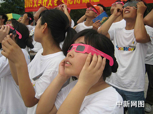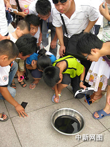 記者在觀測現(xiàn)場看到,一些天文愛好者早已架起了專業(yè)的望遠鏡;而許多市民則走起“平民路線”,戴起墨色眼鏡或黑色遮光玻璃片擋住太陽光,以便更清晰地看清日食;更有“經(jīng)驗老道”的市民,在臉盆里倒上墨汁,觀看太陽的倒影,平添了幾分傳統(tǒng)神秘色彩,引來了無數(shù)的圍觀者。