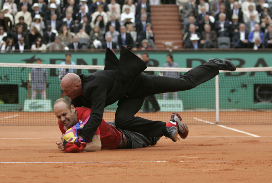 法網(wǎng)男單決賽場(chǎng)上,一位費(fèi)天王的癡心球迷沖入球場(chǎng),強(qiáng)行將自制的一頂帽子戴到費(fèi)德勒的頭上。安保人員及時(shí)出現(xiàn),將狂熱粉絲架出場(chǎng)外。