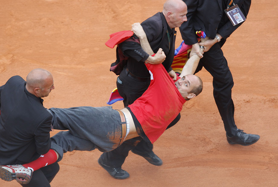 法網男單決賽場上,一位費天王的癡心球迷沖入球場,強行將自制的一頂帽子戴到費德勒的頭上。安保人員及時出現(xiàn),將狂熱粉絲架出場外。