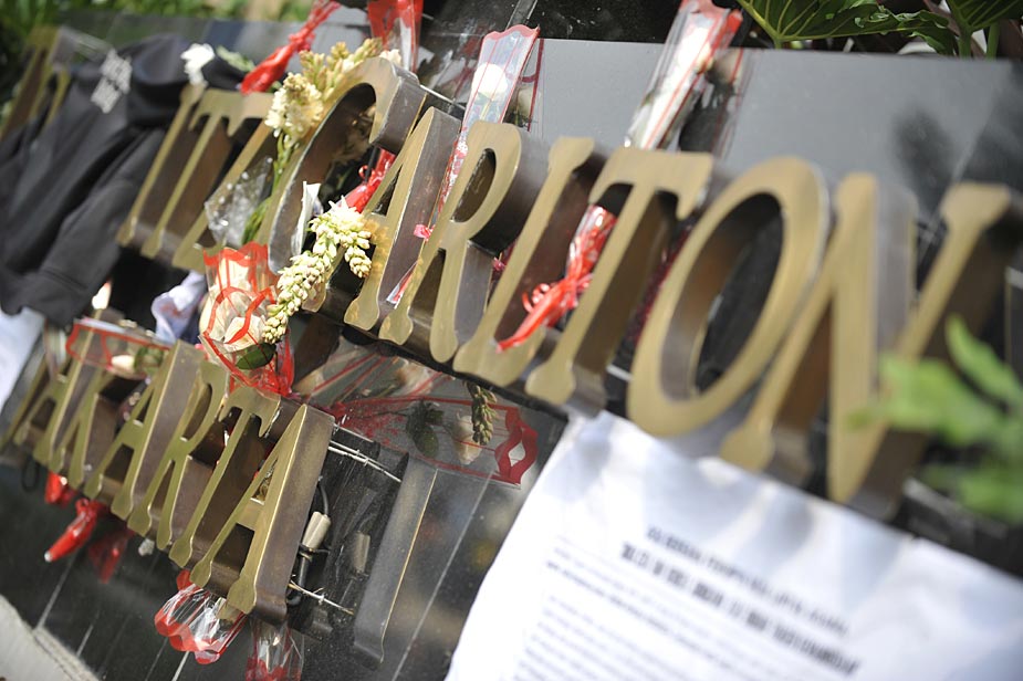 7月18日,印度尼西亞首都雅加達的民眾紛紛來到發生爆炸的萬豪酒店和麗嘉酒店,向死難者獻花表示哀悼。