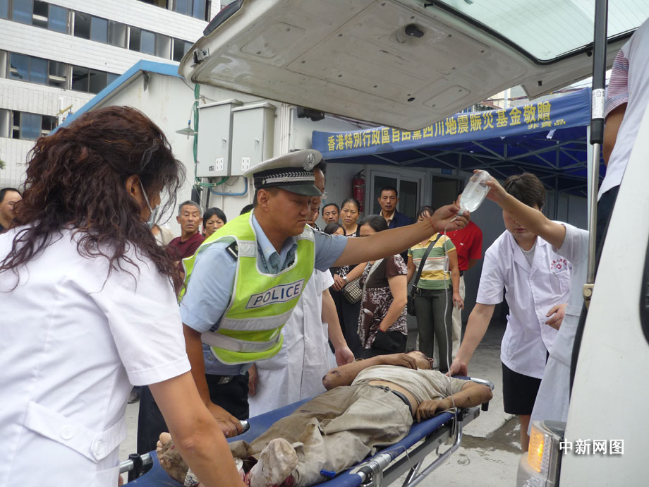 25日凌晨四點(diǎn)鐘左右,汶川縣境內(nèi)國(guó)道二一三線徹底關(guān)大橋被山上飛下來(lái)的巨石砸斷,已造成100米的橋面坍塌,7輛汽車(chē)受損,12人不同程度受傷,3人死亡,都汶路通行中斷。圖為汶川縣人民醫(yī)院正在積極搶救傷員。 汶新 攝