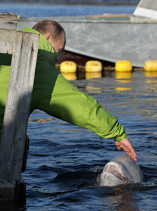 俄羅斯總理普京7月31日在太平洋的契卡洛夫島為一條白鯨裝上衛星追蹤器。其后他更幫手喂其他白鯨魚吃。
