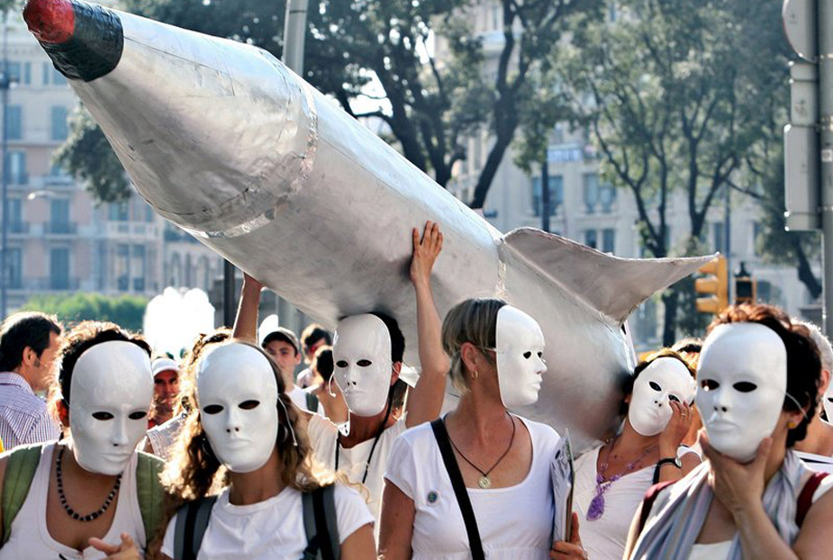 西班牙巴塞羅那,人們帶著面具舉行集會,紀念日本廣島遭原子彈轟炸64周年。