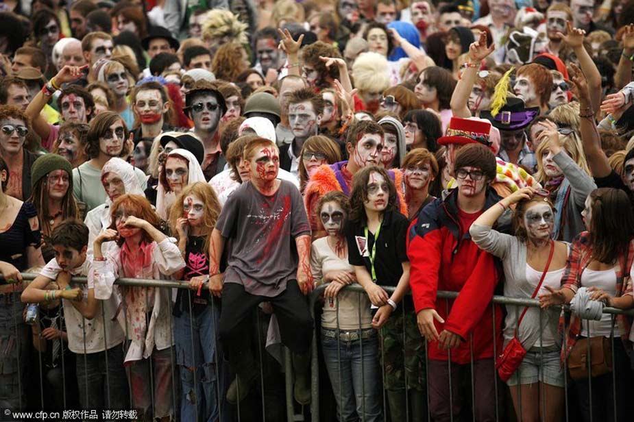 2009年8月6日,英國(guó)赫里福德郡Eastnor城堡,人們化裝成“僵尸”出現(xiàn)在大寒音樂節(jié)上,欲打破同一地點(diǎn)聚集最多“僵尸”的世界紀(jì)錄。