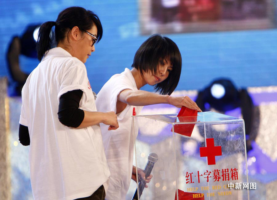 “跨越海峽的愛心”——大陸同胞援助臺灣“莫拉克”臺風受災同胞賑災晚會在北京舉行。眾多文體界明星在現場亮相,獻出一片愛心。圖為劉若英、許茹蕓在晚會現場捐款。 中新社發 杜洋 攝