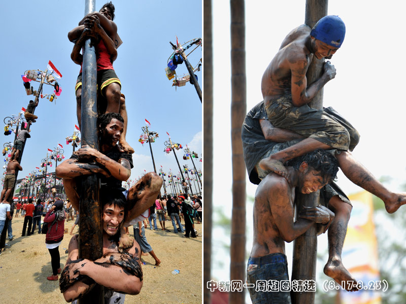 8月17日,近2000名年輕人在印尼首都雅加達一個公園內參加爬桿大賽,慶祝國家獨立64周年。點擊觀看詳細內容