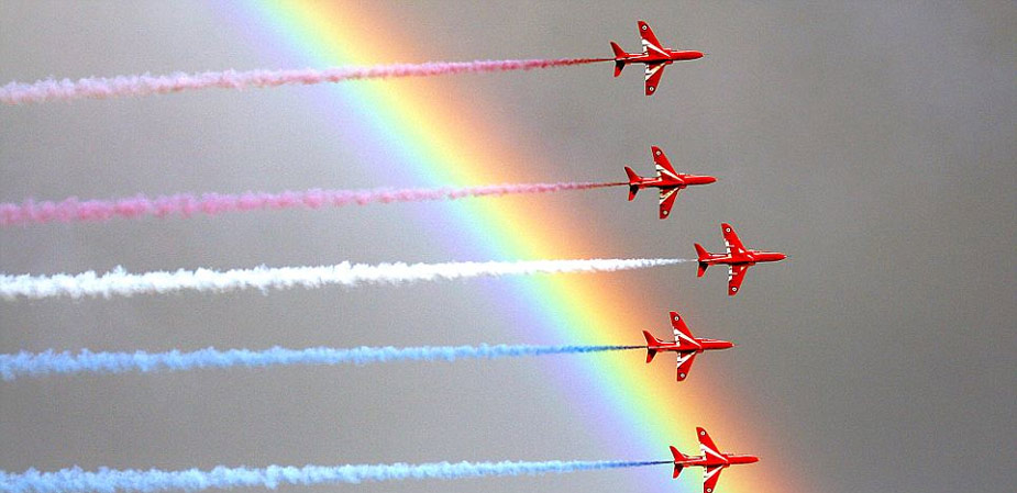 據英國媒體近日報道,英國皇家空軍“紅箭”飛行表演隊20日在英國康沃爾郡福伊港進行飛行特技表演時,恰巧天邊出現一道彩虹,相映成輝,異常漂亮。