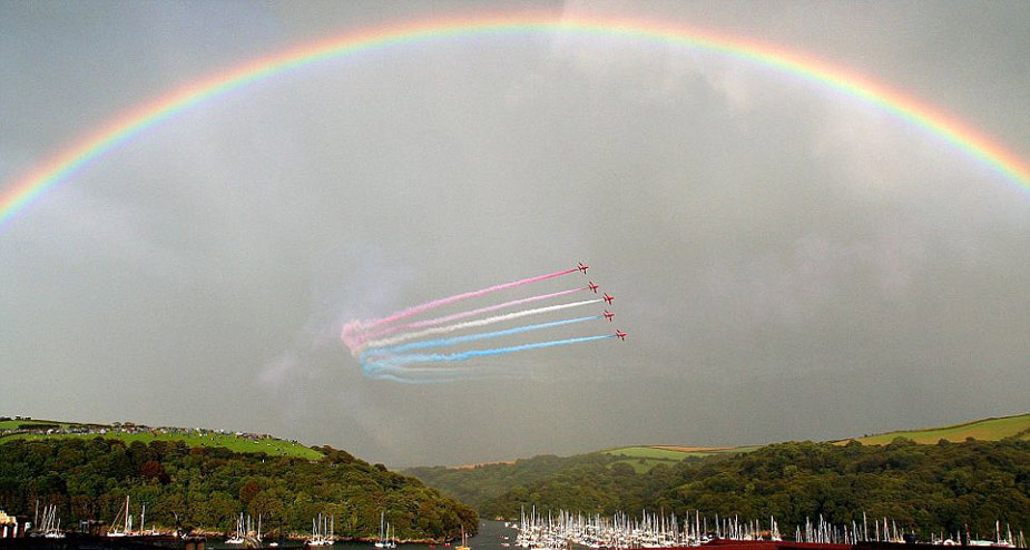 據(jù)英國媒體近日報(bào)道,英國皇家空軍“紅箭”飛行表演隊(duì)20日在英國康沃爾郡福伊港進(jìn)行飛行特技表演時,恰巧天邊出現(xiàn)一道彩虹,相映成輝,異常漂亮。