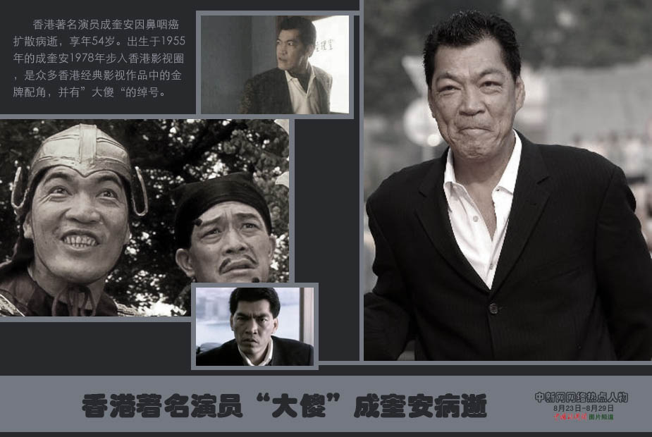 中新網本周熱點人物之——成奎安 北京時間27日晚23時45分,香港著名演員成奎安因鼻咽癌擴散病逝,享年54歲。出生于1955年的成奎安1978年步入香港影視圈,是眾多香港經典影視作品中的金牌配角,并有”大傻“的綽號。