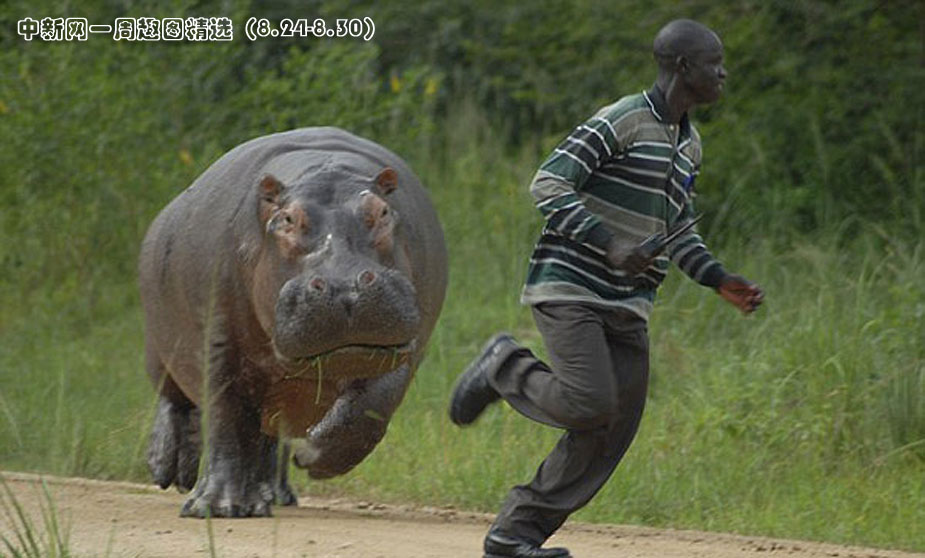 烏干達獵場一只大河馬在吃午餐時遭到一名看守人打擾,河馬怒了,突然沖了出來,看守人被嚇得落荒而逃。圖片來源:中國新聞網