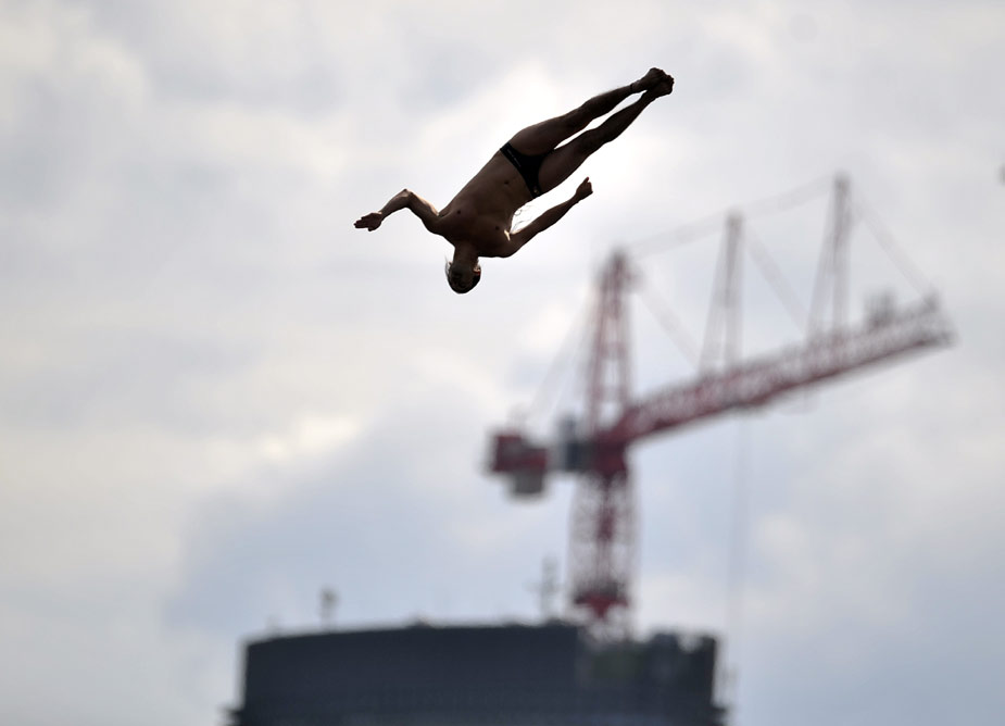 當(dāng)?shù)貢r(shí)間8月29日,世界懸崖跳水系列賽在德國漢堡舉行。圖片來源:中國新聞網(wǎng)