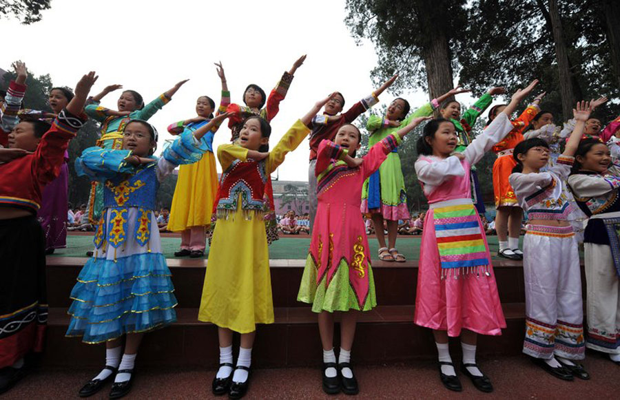 北京中關村三小開學典禮上,56個民族小伙伴齊唱高唱《好大的家》。本學年民族教育主題為“祖國發展我成長,民族團結一家親”。李木易/CFP
