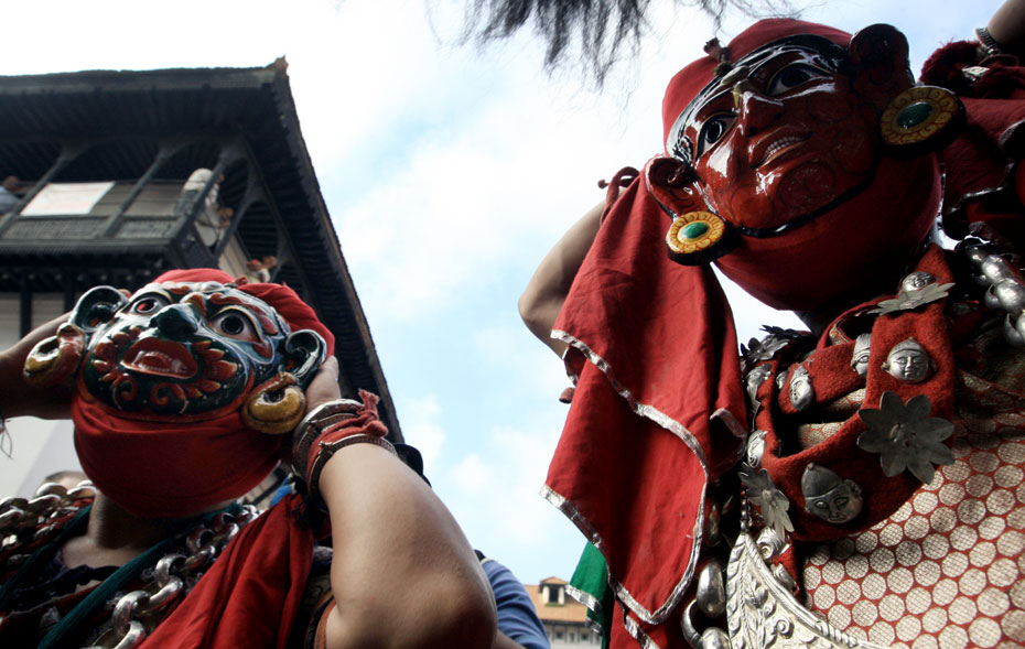 圖為節(jié)日當天人們戴上傳統(tǒng)的尼泊爾面具載歌載舞。