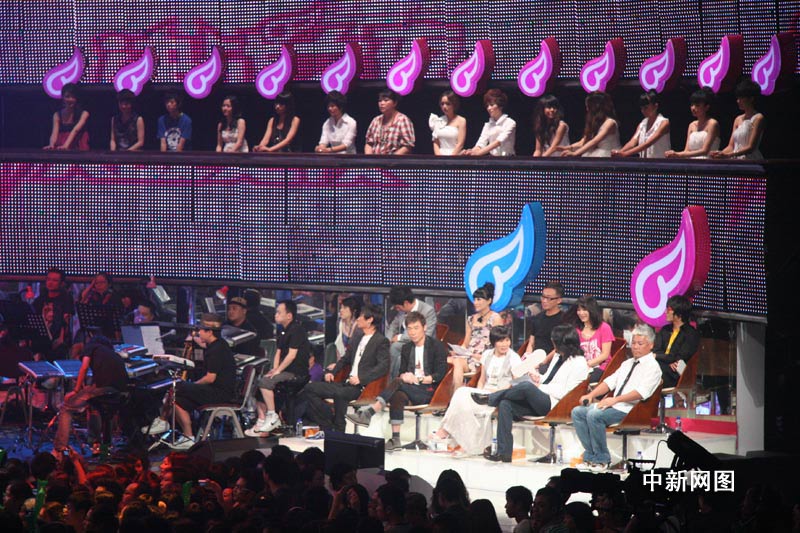 9月4日,湖南衛視“2009快樂女聲”進行最后的總決賽。江映蓉、黃英、李霄云這3強選手將通過18首歌曲的演繹,向全國總冠軍發起最后沖擊。圖為現場的評審。劉雙雙攝