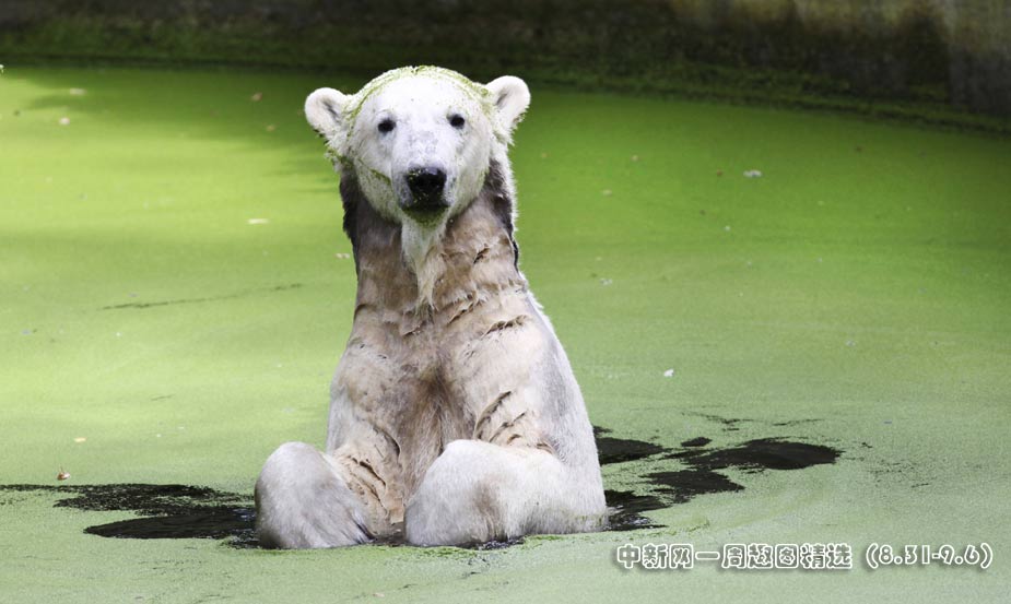 9月4日,德國柏林動物園的明星北極熊克努特正在水中“自娛自樂”。圖片來源:中國新聞網