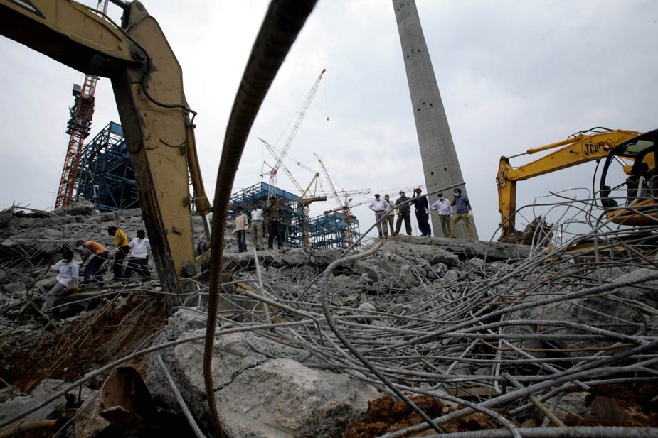 印度中部一座在建電廠的巨型煙囪23日下午發生倒塌,目前估計已有至少100人罹難。圖片來源:中國新聞網