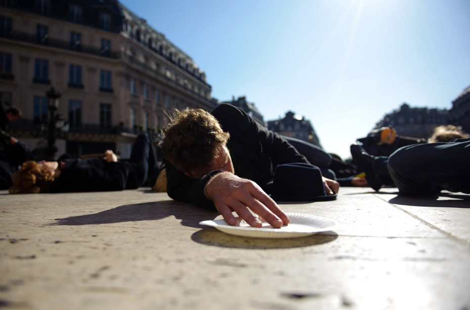 10月15日,示威者身穿黑色衣服、手持空盤子在巴黎歌劇院前抗議。他們此舉是為了呼吁人們關注世界上的饑民。圖片來源:中國新聞網