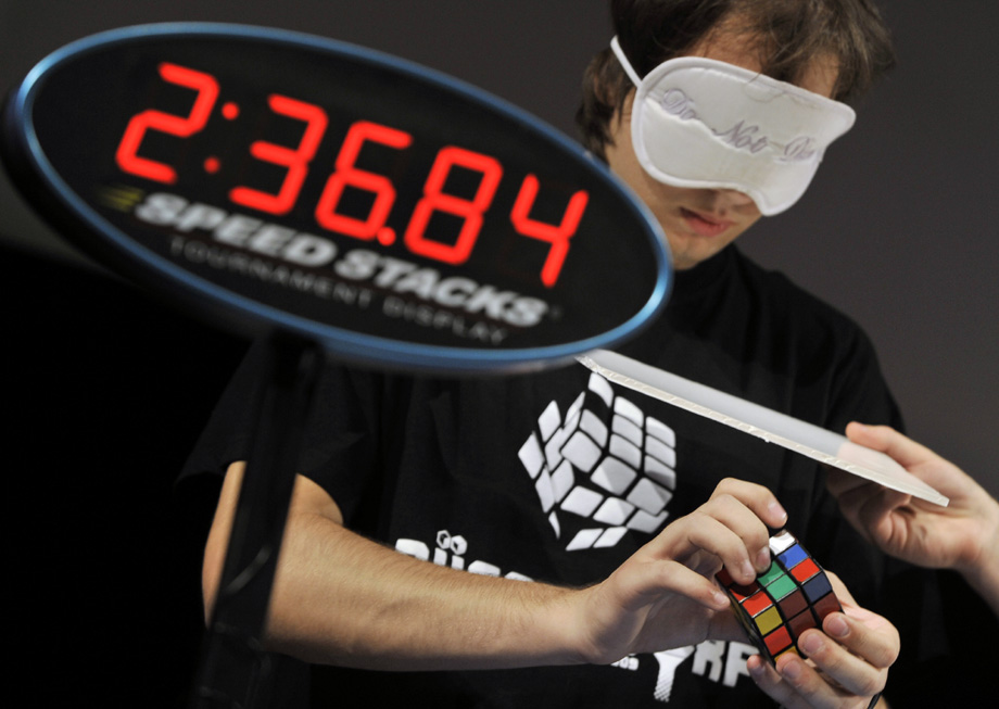 圖為一名參賽者在參加盲賽。10月18日,匈牙利魔方大賽在首都布達佩斯舉行,各路魔方高手展開對決。圖片來源:中國新聞網